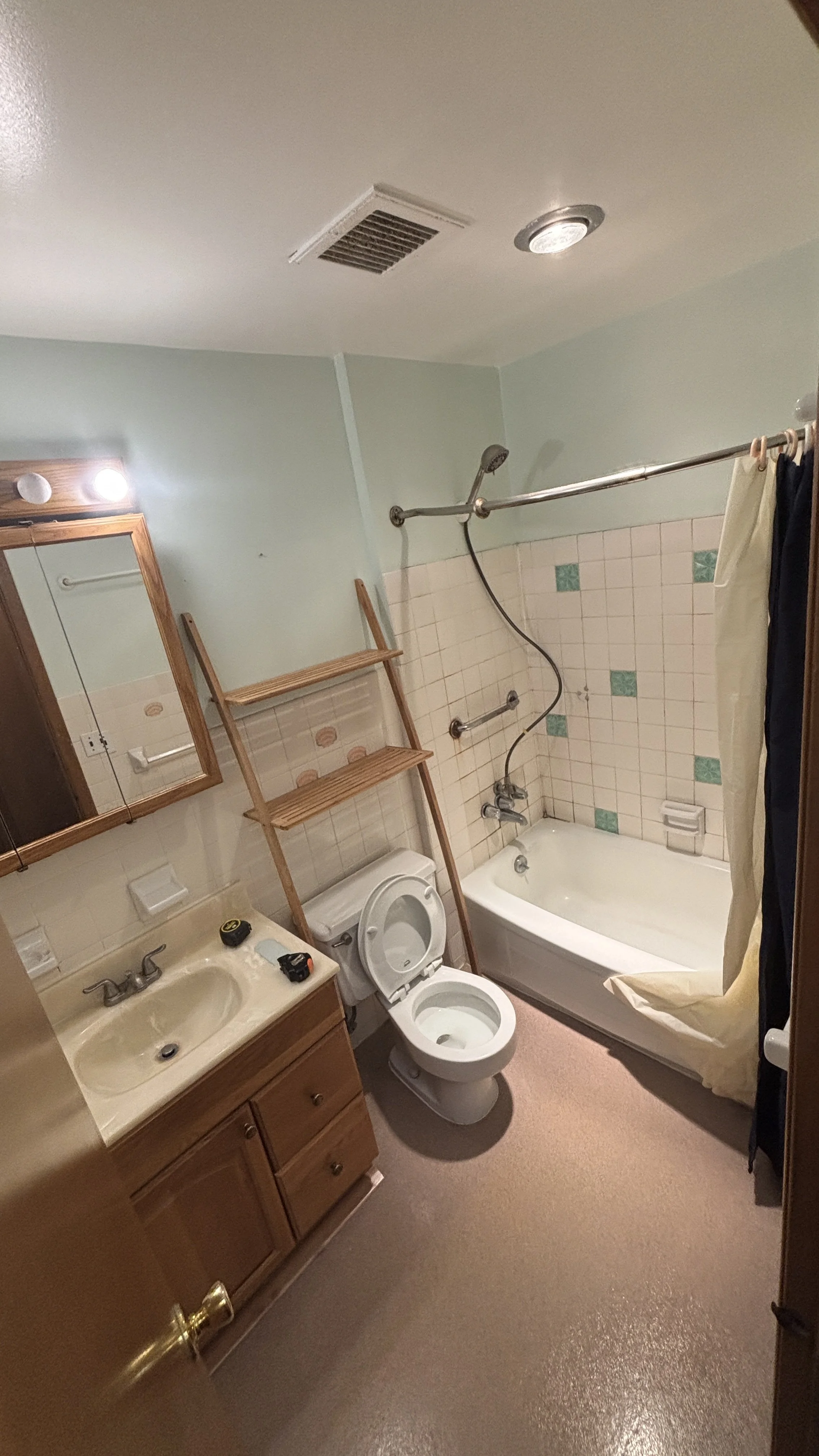We were able to turn this into a nice usable shower without completely gutting the bathroom. We started by removing the remaining tile on the floor and 2 exterior walls, poured a new concrete shower pan to correct the pitch, installed new ceramic tile, and swapped out the original shower valve assembly.