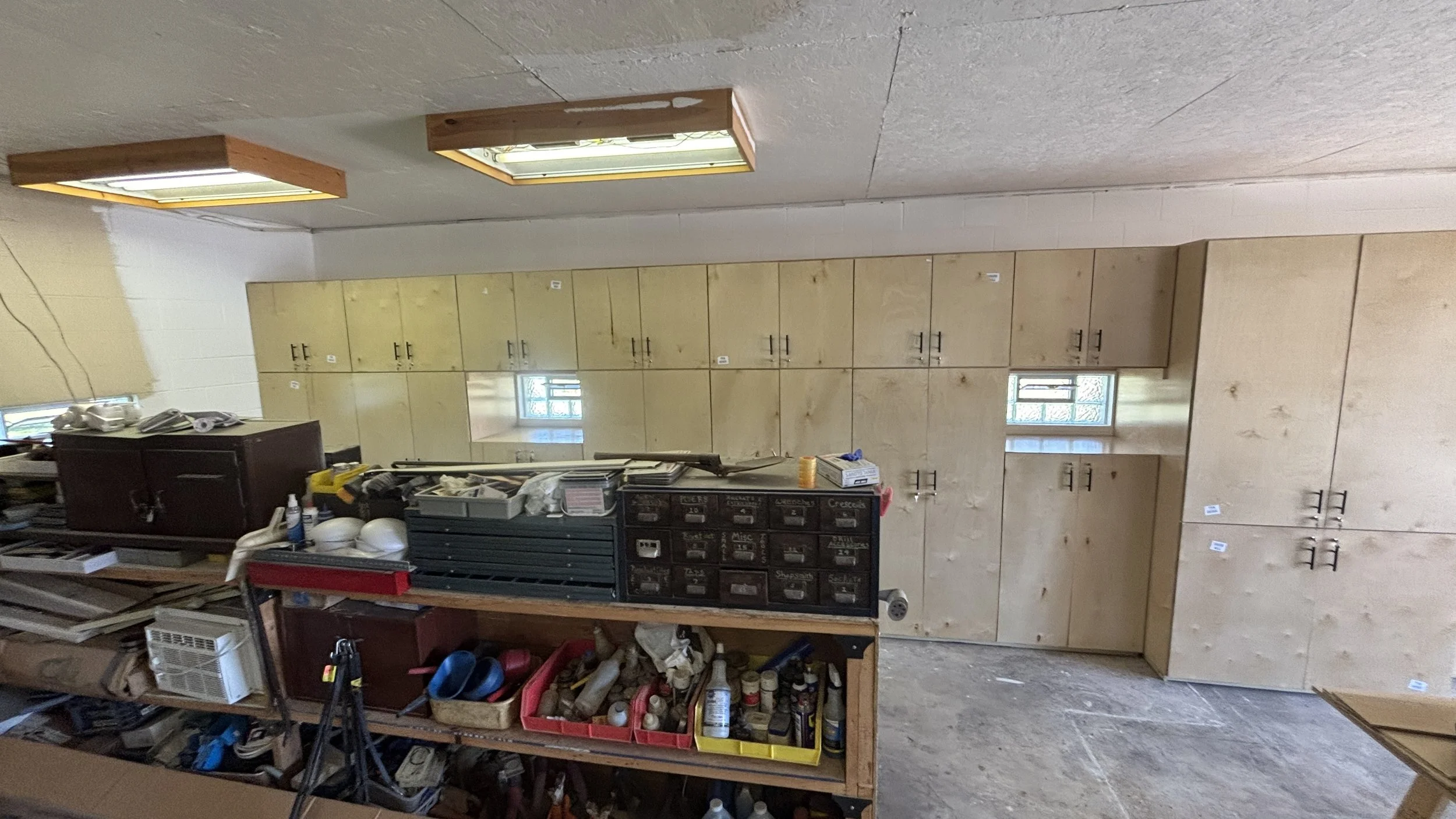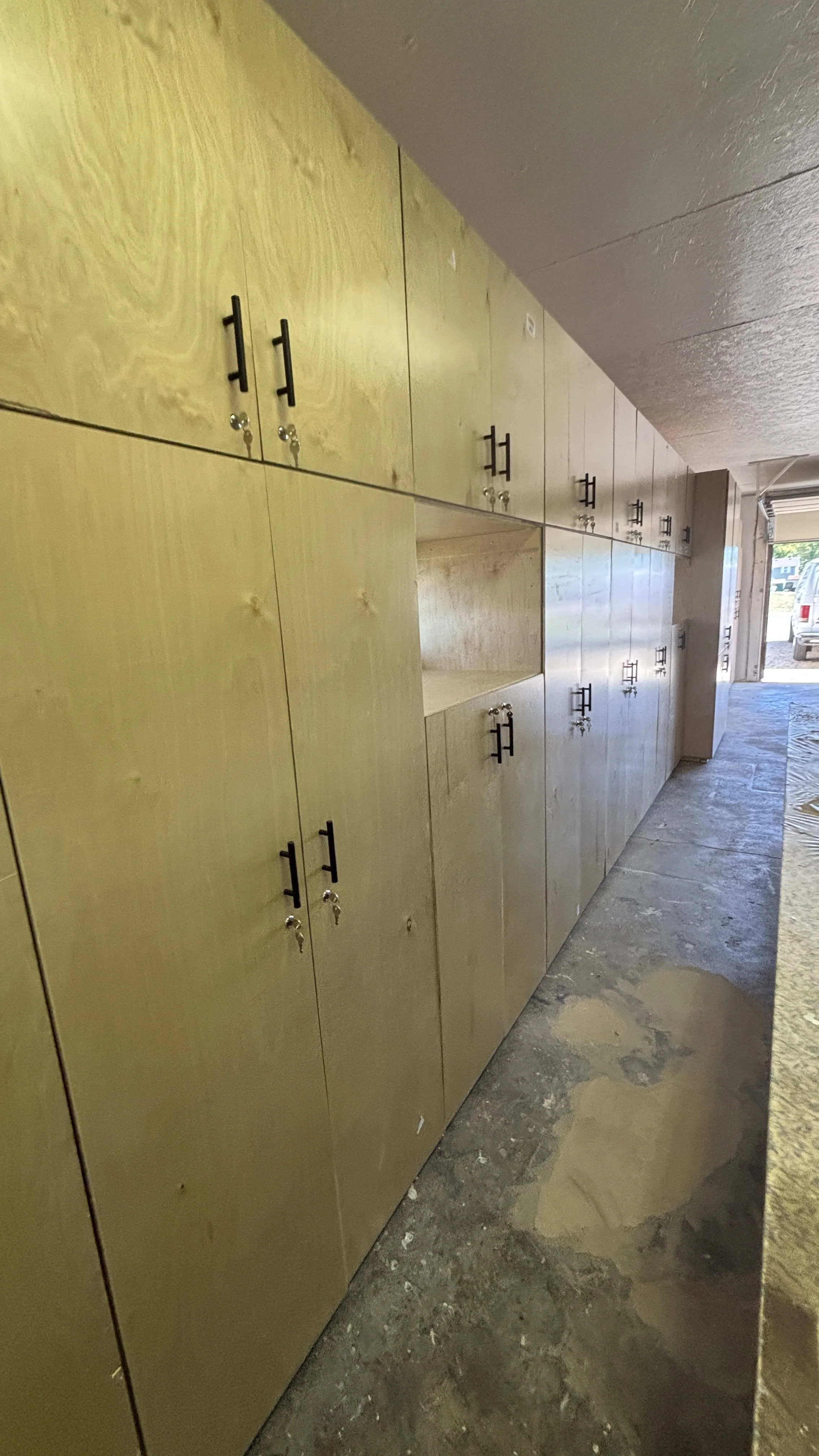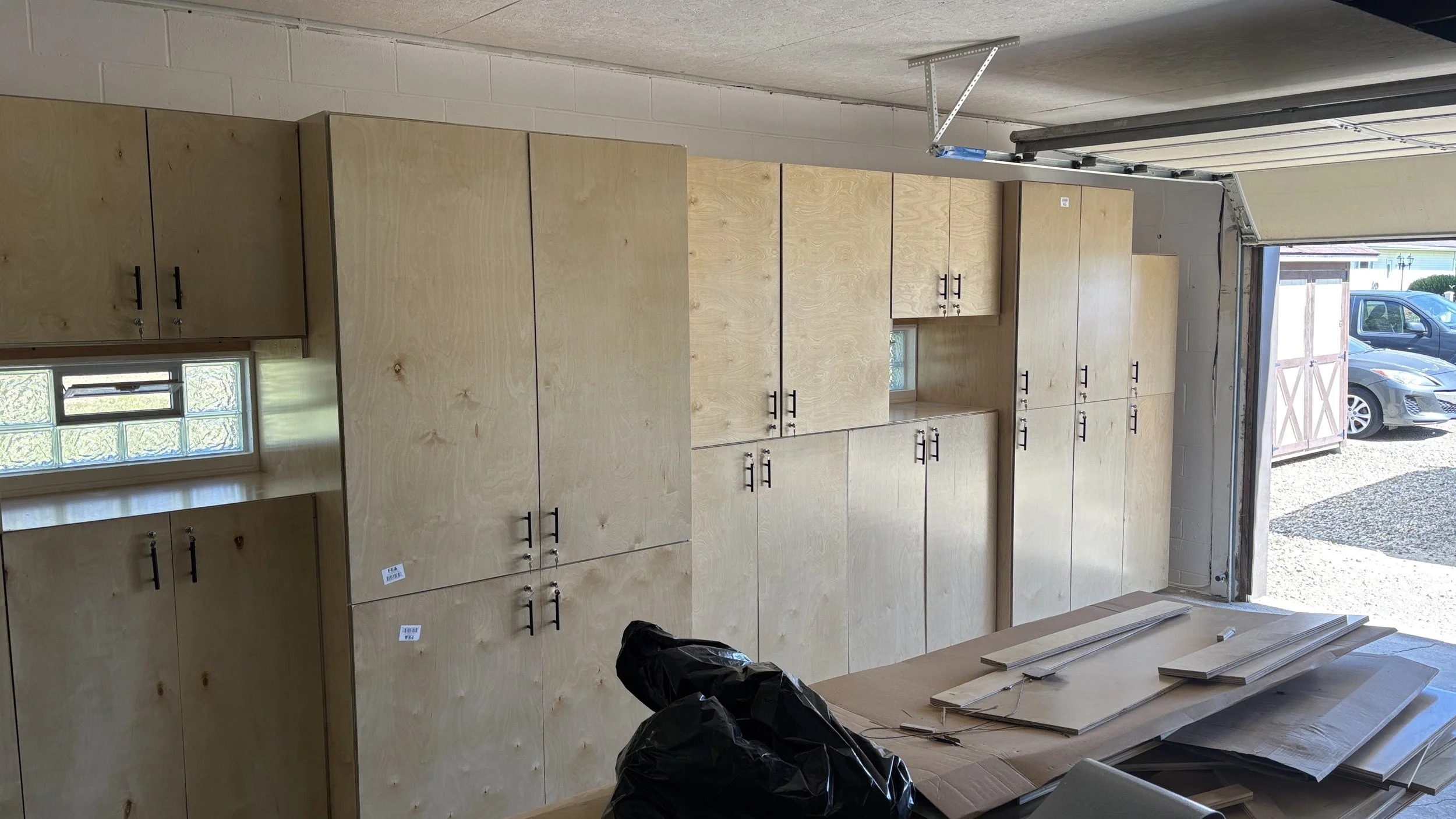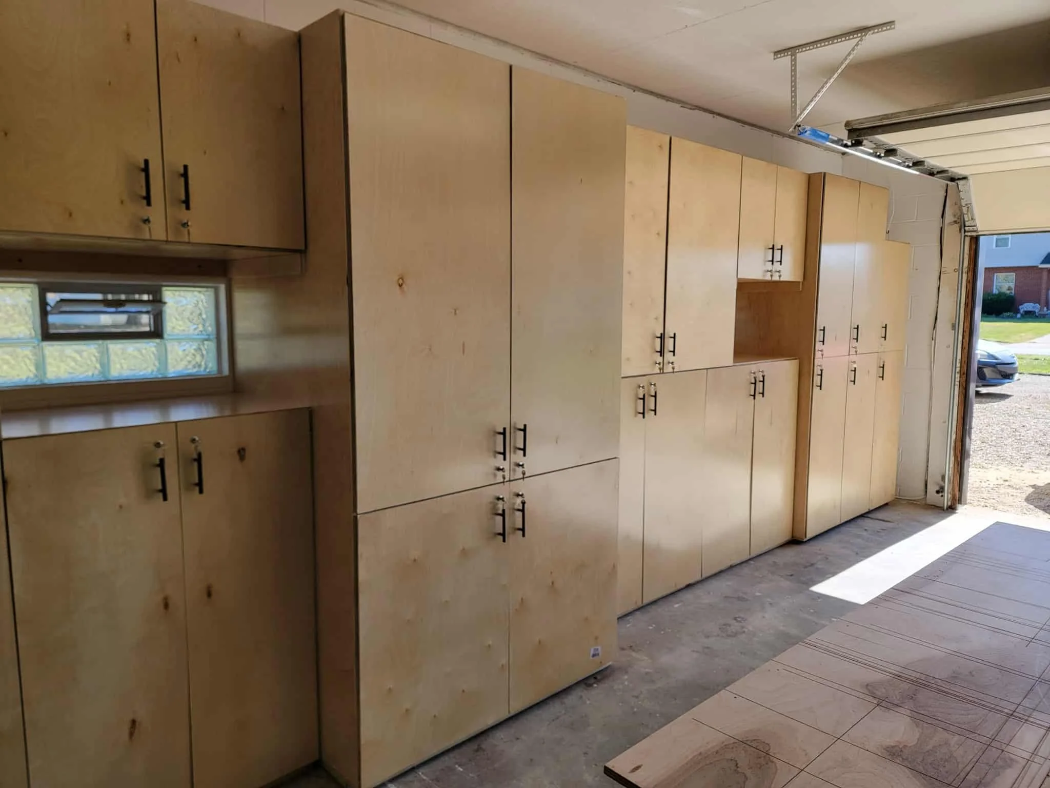 Custom cabinetry built in a garage. This garage is two cars deep, and the customer needed custom cabinets for storage. Cabinets were built to the specific needs of our customer, including a variety of different sizes to store large items like folding tables and chairs. Locks were installed on each door to keep tools and other valuable items safe. This was a large project, and we were very happy with how they turned out.